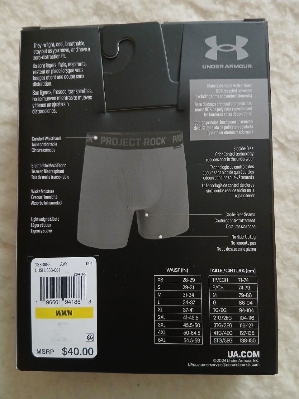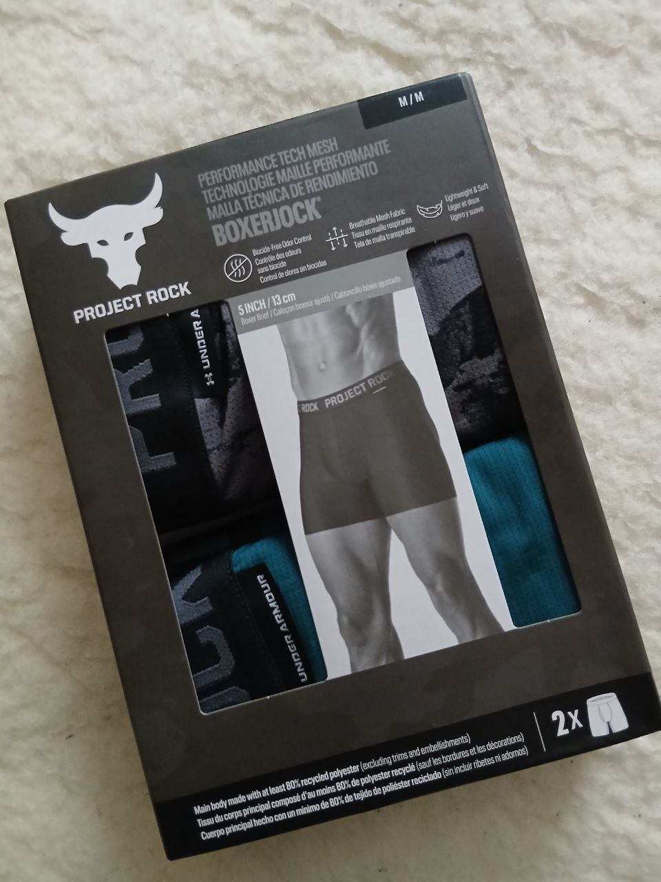 Under Armour Project Rock Performance Tech Mesh Boxerjock , упаковка 2 шт, довжина 5″, матераіл: 88% перероблений поліестер, 12% еластан, перероблений круговий трикотаж. В тканині є мікроотвори для вентиляції (див на фото 5).
